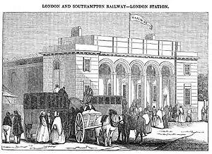 Nine Elms railway station in the London district of Battersea was opened on 21 May 1838 as the London terminus of the London and Southampton Railway which on the same day became the London and South Western Railway. The building in the neoclassical style was designed by Sir William Tite. The station was inconveniently situated for travel to central London, with the necessity to complete the journey by road or by the steam boats connecting the station to points between Vauxhall and London Bridge.[1]
