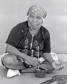 After her husband's death in 1998, the volume of paintings she produced increased.[2] Her style is reminiscent of some of Tjungurrayi's work, but her subject - women's lives and experiences and their role in mythology – differs.[2][8] Comparisons have been drawn between her work and that of other Papunya Tula artists, such as Makinti Napanangka and Inyuwa Nampitjinpa.[2] Her status not just as an artist, but as a guardian of cultural heritage meant she was highly regarded in her community and beyond in her lifetime.[9] The palette she used and the way the paint is layered on the canvas is seen as reminiscent of how body paint is used by women in ceremonial activities.[10]