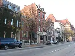 Few Cincinnati streets retain such a cohesive collection of nineteenth-century architecture as do these three blocks of Ninth Street. Although the buildings were erected over a span of more than a century, they are remarkably similar in their construction: examples of the Queen Anne, Italianate, and Greek Revival styles of architecture are found in the district. Throughout the years that the district was constructed, Cincinnati was a city of pedestrians, and the diversity of the district's buildings highlight this status: within the district's boundaries can be found shops, houses, apartment buildings, and other commercial structures.[3] Among the most important buildings in the district are the Abraham J. Friedlander House, the Brittany and Saxony Apartment Buildings, and the Phoenix Club,[4] all of which were listed on the National Register of Historic Places between May 1979 and March 1980. Eighth months after the last of these four buildings was added to the National Register, the district itself was accorded a similar distinction.[1]