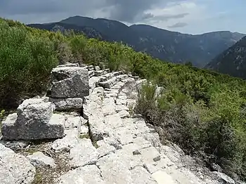 The ruins are plentiful but in a poor state. They include part of the well-built city wall, a theatre, a stadium, a paved agora with stoa and some bases bearing inscriptions. The necropolis to the west includes sarcophagi and constructed tombs.[9]