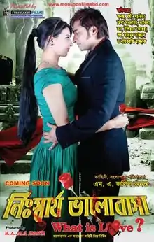 Nishwartha Bhalobasa (Bengali: নিঃস্বার্থ ভালোবাসা, lit.'Selfless Love', English title What is Love?) is a Bangladeshi romantic-action-comedy film directed by Ananta Jalil, starring Ananta and Barsha in the lead roles.[1][2] The film was produced by Ananta Jalil under the banner of Monsoon Films. Action hero Ananta made his debut as a director in this film.[3] Nishwartha Bhalobasa was premiered at 66th annual Cannes Film Festival.[4][5] The film was released on Eid al-Fitr, 2013 in Bangladesh.[6][7][8][9]