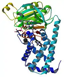 - ↑ El Hammi E, Warkentin E, Demmer U, Limam F, Marzouki NM, Ermler U, Baciou L (February 2011). "Structure of Ralstonia eutropha flavohemoglobin in complex with three antibiotic azole compounds". Biochemistry. 50 (7): 1255–64. doi:10.1021/bi101650q. PMID 21210640.