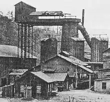 The preliminaries to the furnace's construction began in 1885, when Valentine and Thomas, an old ironmaking firm of Bellefonte, decided to sell off its properties. These then consisted of Bellefonte Forge, on Logan Branch just south of Bellefonte, and Bellefonte Furnace, a cold blast charcoal iron furnace lying about a mile south of the town, also on Logan Branch,[1] as well as holdings in local iron ore mines. Both plants were served by the Bellefonte, Nittany and Lemont Railroad, a subsidiary of the PRR. The ironworks and ore lands were bought on August 2, 1886, for $400,000, by the Valentine Ore Land Association,[2] whose principals organized the Centre Iron Company to erect a new iron furnace on the site of Bellefonte Furnace, which was to be torn down. A $600,000 mortgage was immediately raised on the properties, to supply the purchase money and funds for rebuilding the furnace.[2] The leaders of the company included Edmund Blanchard, W. M. Stewart, and B. K. Jamison, a Philadelphia banker.[3] The plant was built in 1887,[4] and the Nittany Valley Railroad was built to supply it with ore. It became necessary to raise additional funds, and in 1887, the Pennsylvania Railroad purchased $75,000 worth of bonds in exchange for exclusive rights to rail traffic to and from the furnace. The first load of ore was delivered by the Nittany Valley on February 28, 1888, and the furnace went into blast on March 4, 1888.[5] The company was originally headed by Jamison,[6] but by 1890, James B. Coryell was president and Jamison vice-president. At this time, the furnace had one 70-foot (21-meter) stack and three hot-blast stoves, with a capacity of 30,000 tons (27,200 tonnes) of iron per year. Ore was supplied from local hematite deposits, and the furnace was fuelled by Connellsville coke.[4] In the same year, however, the failure of Jamison's bank precipitated the closure of the furnace by the sheriff on November 15, 1890. It was subsequently sold under foreclosure.[7]