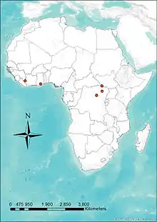 It is found in the Democratic Republic of the Congo, Ivory Coast, Ghana, Equatorial Guinea and South Sudan.[4] Its natural habitats are subtropical or tropical moist lowland and dry forests.