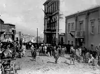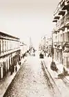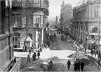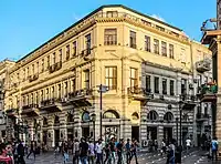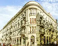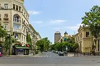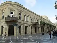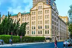 In 1859, there was a strong earthquake in Shamakhi, which resulted in the demolition of the Shamakhi Governorate and the creation of the Baku Governorate in the center of Baku.[3][4] After becoming the governorate, it was necessary for the city to undertake ambitious construction projects.[5] In the first years after the order of 1859 was signed, the population of Baku began to rise. New caravanserais were being constructed along the northern part of fortress walls, each of which occupied a whole quarter, trading rows and stores. Subsequently, this part of the city became the central trading area and it was necessary to develop a cohesive construction plan. It was entrusted to Gasim bey Hajibababeyov and a group of engineers and architects from Saint Petersburg.[6] According to the group, construction of new highways, beginning from Icheri Sheher fortress in all directions, was the focus of their urban planning.[7] Their design philosophy is reflected in the first governorate urban plan of Baku, created in 1864.[8] Initially Nizami Street was called “Torgovaya Street”, because of its status as a trade center. Later, in 1879 it was officially renamed “Gubernskaya Street”, but citizens still called it “Torgovaya”.[9] The street began on Mariinskaya Street (later Korganov Street, now Rasul Rza Street), where reputable multi-storeyed houses of wealthy people were located and reached to so called “Black City” of Baku, where there were oil wells and other industrial developments. The late 19th century was characterized by rapid economic development of the city and the second massive influx of people from other governorates of the Russian Empire, the reason of which was the incorporation of new oil wells in the Absheron Peninsula. Marine infrastructure was also developed and the general plan of fortress vorstadt and the marine port was significantly expanded, and the city eventually became one of Southern Russia's most significant trading hubs. The rapid economic growth of Baku was followed by the arrival of affluent industrialists who began constructing new buildings. A great number of buildings on this storied street were constructed by oil magnates such as Musa Naghiyev, Shamsi Asadullayev and Murtuza Mukhtarov, and designed by prominent architects such as N.A.von der Nonne, M.Gafar Ismayilov, A.Hajibababeyov, K.B.Surkevich, J.V.Goslavski, Józef Plośko, Zivar bey Ahmadbeyov, E.Edel and G.Termikelov.[10][11]