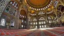 The mosque has a main dome that is 31 m (102 ft) high and 24 m (79 ft) wide that is covered in 48 tons of lead. There are an additional 4 half domes and 21 smaller domes. Inside the mosque are authentic Turkish ceramics on the walls and calligraphy on the ceiling.[5] The dome is patterned with Turkish art and the custom-made carpet below is a reflection of it. There are 4 minarets that are 55 m (180 ft) high, which have stairs that go up to three platforms. There are 232 stained glass windows.[1]