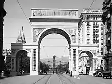 ![]() No-Ni-Shee Arch, 1916. The Brigham Young statue is framed by the arch, and the Salt Lake Temple is to the left. | |