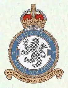 | Squadron Badge heraldry | A lion rampant chequy[2] "The lion in the squadron's badge denotes fighting power and the black and white check the squadron's day and night capability"[1] |