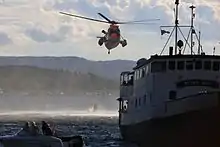 Search and rescue was at the time only a secondary role for various air force units, such as the Albatross, Bell UH-1B and Bell 47. Norway lacked the dedicated SAR service that Denmark had. This became evident in 1966, when the Norwegian ferry Skagerrak sank off the Danish coast in September 1966. Everyone on board was saved, but it was questioned whether this would have been the case if the incident had occurred in Norwegian waters.[54] The task was given to the Ministry of Justice, who as a temporary solution from 1968 to 1973 signed an agreement with Helikopter Service to operate two Sikorsky S-61 out of Sola and Bodø.[55]