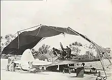 No. 76 Squadron completed its movement to Strauss Airfield south of Darwin in early October and became part of the force responsible for defending the area against Japanese air raids on military facilities and Allied shipping.[7] It conducted relatively little flying during October due to shortages of equipment and a high sickness rate from malaria, however.[5] The squadron's flying effort increased in November and December and in January 1943 it was scrambled to intercept several Japanese raids. During one of these attacks Squadron Leader Truscott shot down a Japanese Mitsubishi G4M "Betty" bomber on 21 January. The Supermarine Spitfire-equipped No. 1 Wing RAAF began to arrive in the Darwin area in January and at the end of the month No. 76 Squadron was transferred to Onslow, Western Australia.[8] The ship carrying the squadron's personnel and equipment arrived at Onslow on 5 February and were unloaded the next day, but on the 12th of the month the squadron moved the nearby "Potshot" airfield as there was insufficient water at Onslow to supply the unit. No. 76 Squadron conducted patrols from Potshot and Onslow during March and April to protect the United States Navy facility in the area, though these were marred by Squadron Leader Truscott's death in a flying accident on 28 March. On 27 April the squadron received orders to move to Bankstown Airport in Sydney to be reequipped with more advanced P-40M Kittyhawks.[9][10] It was relieved at Potshot by a flight of CAC Boomerang fighters from No. 85 Squadron.[11]