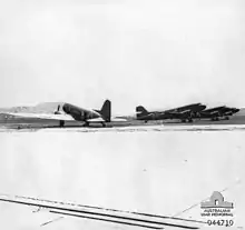 No. 8 Squadron was reformed at RAAF Station Canberra on 12 March 1943 equipped with DAP Beaufort as a medium and torpedo bomber squadron. The squadron practiced cross-country navigation, bombing and air-to-air gunnery around Canberra, as well as torpedo training at Jervis Bay, before moving to Bohle River in northern Queensland in July 1943. The squadron then moved to Goodenough Island, Papua New Guinea, in September and began flying combat missions against Japanese airfields and supply dumps and shipping in the New Britain area.[3] In December, one of the squadron's aircraft sank a 6,834 tonne Japanese ship with torpedoes in Simpson Harbour.[4] Following the isolation of Rabaul, the squadron moved to the New Guinea mainland in April 1944 and flew strikes against Japanese positions near Wewak and anti-shipping patrols until the end of the war from bases around Nadzab and Tadji. No. 8 Squadron was disbanded at Tadji in New Guinea on 19 January 1946.[4][2]