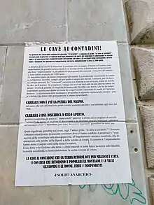 - ↑ "Cave, la lettera degli industriali: "Basta aggressioni contro i cavatori e il mondo del marmo"". 22 September 2020.