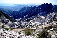 Between the end of the eighteenth and nineteenth centuries there was a rapid increase in quarries, which began to be concentrated in the hands of a few large concessionaires,[99] and the "industrialization" of mining, which attracted a large number of workers from the mountain communities, moving them from traditional agro-pastoral occupations to mining ones.[100] The construction of the Carrara Private Marble Railway and the Port of Carrara dates back to this period. This process continued in the twentieth century, with the construction of infrastructures such as the Balzone cableway,[101] in 1907 and the branch for Arni of the Versilia tramway, inaugurated in 1923.