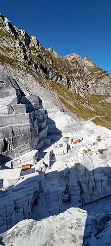 The Apuan Alps stone quarries were probably already used since the Iron Age by the Ligurians of Ameglia, but the actual mining activity developed from the Roman era, and experienced the greatest development under Julius Caesar (48-44 BC). Of the oldest quarries distributed in the Torano, Miseglia and Colonnata basins, not much remains, since the mining activity which continued over the centuries has caused their progressive destruction. In this way, ancient quarries such as that of Polvaccio and Mandria (Torano) and Canalgrande (Miseglia) have been lost. On the other hand, the quarries of La Tagliata (Miseglia) and Fossacava (Colonnata) are still intact, although poorly valued from a historical-archaeological and tourist point of view.[95][96] Another quarry of certainly ancient origin is the so-called Cava Romana di Forno ("Forno Roman Quarry"), subject of a legal dispute for environmental violations[97] and whose environmental licence was not renewed in 2017.[98]
