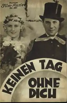 No Day Without You (German: Keinen Tag ohne Dich) is a 1933 German comedy film directed by Hans Behrendt and starring Lee Parry, Oskar Karlweis, and Paul Hörbiger.[1] It was shot at the Johannisthal Studios in Berlin.