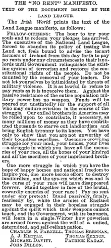 ‘No Rent Manifesto’ The Land League calls for a rent strike against landlords, 18 October 1881, pp.90–91; Quercus, London (2008), ISBN 978-1-84724-672-1 - ↑ Aldous & Puirseil: p.90