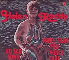 "No Sad Song" is a song written in 1971 by Carole King and Toni Stern. It was recorded by Australian singer-songwriter Helen Reddy, appearing on her album Helen Reddy, released in November 1971. The single peaked at number 62 in January 1972 on the Billboard Hot 100 chart,[1] staying on the chart for eight weeks. "No Sad Song" showed up on the Easy Listening (Adult Contemporary) chart for 4 weeks, rising to number 32.[2] It also reached number 51 on the pop chart in Canada's RPM magazine.[3]