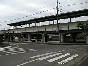 The station consists of one elevated island platform with the station building underneath. The station is unattended.