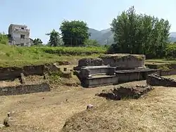 The most important necropolis was south of the city at the foot of Mount Albino in the locality of Pareti. Tombs were often in tuff from Fiano or in limestone from Monte Albino. Painted or bronze vases were found in these tombs and various objects of iron, lead, and other metals.[12] In the 1950s more archaeological excavations brought to light more than a hundred burials of the sixth and fifth centuries BC and others from the Samnite period, i.e. from the 4th and 3rd centuries BC.[13] Etruscan amphorae also testified to the city's contacts.[14]