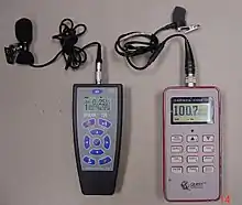 Noise dosimeters are worn by workers in order to track their sound exposure over a period of time. With the accuracy of a type 2 sound level meter, a majority of noise dosimeters measure within ±2 dB A. One must make sure to the noise dosimeter is properly calibrated and kept out of extreme temperature and humidity. The noise dosimeter is typically programmed by a hearing conservationist, sound engineer or audiologist. When the professional is setting up the noise dosimeter, settings like frequency of sound sampling and log information should be considered. When placing any dosimeter, the microphones should be clipped to the shoulder with the microphone facing upwards. The microphone should be placed in the open and clear from any surrounding fabric. It should also be protected from any wind source when outdoors and should have a wind screen over it for protection if needed. Over the course of the day, the dosimeter will measure the time-weighted average of the sound level the user experienced. It is important to make sure the batteries are fully charged since the dosimeter often has to run for 8 to 10 hours over the course of the work shift. Noise dosimeters do not record the user's voice, so it is important to teach the user how to operate and successfully use the device so the end result is not influenced by the user's tampering.[9]