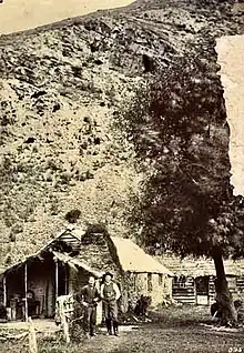 A 1924 report claimed that during the gold rushes Nokomai township had over 2,000 people, but by 1924 Glenfalloch's stone homestead stood alone. In the 1870s there was a wide main street, with Thomas Aiton’s Myall Hotel,[20] Thomas Whitaker's Provincial Hotel (c.1862-76)[37][38] and Job Coulam's United States Hotel (burnt down in 1888).[39] As well as running a store and hotel, Thomas Aiton was also secretary of a gold mining company wound up in 1874.[40] After a petition to the Education Board,[41] on 31 October 1870, a school for 50 children opened.[20] In 1922 it had 9 students.[42] The school seems to have closed between 1938[43] and 1943,[44] attendance still being recorded in 1934.[45] However, the 1924 report said it had closed and its bell moved to Athol school. The teacher, Henry Thurston Evans, set up the Nokomai Weekly Herald,[20] which was hand-written on 4 pages of small post folio.[46] It lasted a year from 11 November 1871.[47]