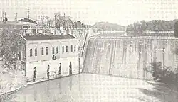 Nolichucky Dam was built by the Tennessee Eastern Electric Company (TEEC) in 1912-1913 for hydroelectricity generation.[4] The dam was initially equipped with two generators, and TEEC added two more in 1923.[3] In 1941, the East Tennessee Light & Power Company obtained ownership of the dam when it purchased TEEC's assets.[5] The Tennessee Valley Authority purchased East Tennessee Light & Power in 1945 for a lump sum that included $1.47 million for Nolichucky Dam. TVA made various improvements, and at its height, the dam was capable of producing 10,640 kilowatts of electricity.[3] TVA used the dam for power generation until 1972, when sediment buildup in Davy Crockett Lake made continued electricity generation impractical.[2] The dam and reservoir are now used for flood control and recreation;[1] the reservoir is a wildlife management area.[2] The continued sediment buildup is resulting in upstream flooding.