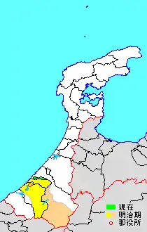 * yellow - areas formerly within the district borders during the early Meiji period