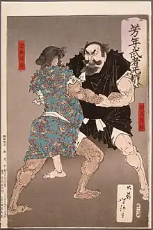 Sukune is said to have lived during the reign of Emperor Suinin (29 BC – 70).[3] Allegedly, in 23 B.C., the Emperor instructed Nomi no Sukune to deal with Taima no Kehaya (当麻蹴速) after he boasted that he was the strongest man "under the heavens". Nomi no Sukune engaged Taima no Kehaya in hand-to-hand combat and broke his ribs with one kick and his back with another, killing Taima no Kehaya.[4][5] It was not modern sumo, but he is regarded as the creator of sumo.[6]