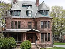 The two homes are nearly identical in design, featuring rock-faced sandstone exteriors and asymmetrical facades. They are richly ornamented with wood paneling and unique interior details, with slight differences between the two houses. Over the years, the homes went through various modifications as they served different purposes, including a nursing home, convent, commune, dormitory, and more. Efforts have been made to restore some of the original spaces, but changes made by previous occupants and academic program requirements have been accommodated.[4]