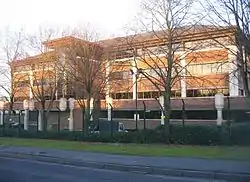 The main building was above three levels of undercover car park. There were three floors, including the entrance (ground) floor. The ground floor featured a large reception area with marble floors, an employee cafeteria, and office wings on either side accessible to employees by swiping their ID card. The offices were constructed around internal garden areas. The upper floors were accessed by a curved, floating staircase, or by lift. Each floor had a circular balcony overlooking the reception area.