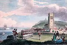 On Wednesday 4 July 1759 both battalions began a march from Norwich to Portsmouth barracks, to accept orders from Major General Holmes.[5] Marching via Beccles, Ipswich, Colchester, Islington, and Petersfield, they arrived at Portsmouth on Tuesday 24 July. During the march, they were reviewed by King George II at Kensington Palace.[1]: 27 Due to the heat, they set off soon after midnight,[6] but were described as being in good spirits.[7] By August the divisions were alternately guarding prisoners of war and undergoing training exercises.[8]