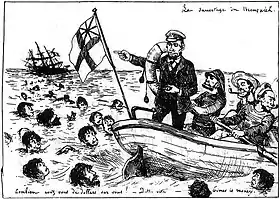 On November 13, he ordered the Governor of Hyogo Prefecture Utsumi Tadakatsu to prevent Captain Drake and crew from leaving Kobe's port, and brought charges of murder against the Captain and his men under the governor's name in the British Court for Japan in Yokohama (upper consular court).[3] The prosecution took place the following day on 14th. The British held a preliminary hearing in Kobe, and then moved the case to Yokohama. On December 8, Judge Hannen of the British Court for Japan in Yokohama found Drake guilty of criminal negligence, and sentenced him to three months imprisonment. However, the consular court rejected any compensation for the families of the victims.[3][5][10] In sentencing Drake, Judge Hannen told him: "We have been accustomed to expect from the merchant service of England heroism and devotion to the interests of the crew and passengers that I am afraid in this case were wanting."[11]