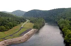 The Norris Basin has been inhabited on at least a semi-permanent basis since the Archaic period (c. 8000-1000 BC). In anticipation of the creation of the Norris Reservoir in the mid-1930s, William Webb of the Smithsonian Institution conducted an extensive archaeological survey of the lower Clinch Valley. Webb located 23 prehistoric sites (which included 12 burial mounds and 34 townhouses) along the Clinch and its immediate watershed between what is now Oak Ridge and Claiborne County.[4] At Saltpeter Cave, located approximately 5 miles (8.0 km) above the mouth of the Powell River, Webb uncovered 13 Native American burials as well as numerous tools and pottery fragments dating to various prehistoric periods.[5] Webb may have been the first to differentiate between the Hiwassee Island culture (c. 1000-1300 AD) and the Dallas culture (c. 1300-1600 AD) that once dominated the Tennessee Valley (Webb noticed that one culture used "large-log" structures while the other used "small-log" structures).[6][7] Webb also speculated, based on his findings in the Norris Basin, that the Cherokee were relative newcomers in the Tennessee Valley, arriving in the area no later than the late 17th century.[8]