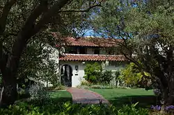 Architect Birge Clark designed the Spanish Colonial Revival house. At the time, the house was Clark's largest and most expensive design. The house's layout features several one- and two-story sections surrounding a patio. The house is built from white stucco with a tile roof; handcrafted ironwork and woodwork is used in the beams and decorations.[2]