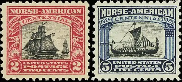 The United States Post Office issued two commemorative stamps in conjunction with the Norse-American Centennial. The illustration on the two cent stamp was an artist's rendition of what the ship Restauration probably looked like based on a drawing of its sister ship. The design on the five cent stamp was from a photograph of the Viking, a ship that sailed from Norway to Chicago in time for the Columbian Exposition of 1893.[9]