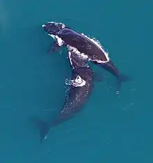 North Atlantic right whales are promiscuous breeders.[24] They first give birth at age nine or ten after a year-long gestation; the interval between births seems to have increased since the 1990s, and now averages three to six years. Calves are 13–15 feet (4.0–4.6 m) long at birth and weigh approximately 3,000 pounds (1,400 kg).[25]
