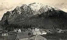 After the Homestead Act of 1862, more settlers ventured to the Snoqualmie Valley, with the first families settling near Borst on the easterly end of Snoqualmie Prairie. In 1865, Matts Peterson homesteaded the site that ultimately became North Bend.[9] In 1879, Peterson sold the property to Borst and moved east of the Cascades. Borst wrote to Will Taylor, who had left the Pacific Northwest to pursue mining in California, and offered him the Peterson homestead in exchange for labor. Taylor returned and became the driving force in developing the town while expanding his property to include a thriving trading post and boarding house for travelers over Snoqualmie Pass. On February 16, 1889, with the upcoming railroad boom, Taylor formally platted a town including his farm, upcoming street plans and building lots, giving it the name "Snoqualmie Prairie".[10] Later that summer, competing Seattle land speculators subsequently platted nearby "Snoqualmie Falls", choosing a similar name. Pressured by demands of the Seattle, Lake Shore and Eastern Railway to avoid confusion, Taylor reluctantly renamed his town "Mountain View".[11] However, the U.S. Post Office Department objected to "Mountain View", as a town with that name already existed in northern Whatcom County. To conclude the matter Taylor agreed to permanently rename the community "North Bend", after its prime location near the large northward bend of the South and Middle Fork of the Snoqualmie River.[9] Taylor was proud of his new, thriving town, but by historical accounts, "He never got over having his town name taken away."[6] North Bend was officially incorporated on March 12, 1909, and grew throughout the 20th century, with an early economic focus on logging, sawmill production, agricultural and dairy farming.[12]
