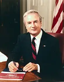In 1977, the North Carolina constitution was amended, allowing governors to pursue re-election to a consecutive four-year term in office. This amendment strengthened the political authority of the office.[27] Following a 1995 referendum resulting in a constitutional amendment effective the subsequent year, the governor was granted veto power, becoming the last governor in the country to be given this power. Mike Easley became the first North Carolina governor to veto legislation after rejecting a bill in 2002.[8] While institutional enhancements increased the formal power of the governorship over the course of the 20th century, this was counteracted by a corresponding rise in the legislature's growing willingness to assert its separate desires in state policy.[28] In 2016, the General Assembly significantly curtailed the number of appointments which could be made by the governor.[29] The incumbent governor is Roy Cooper, a Democrat who assumed office on January 1, 2017.[30] He is the 75th person to hold the office.[31]