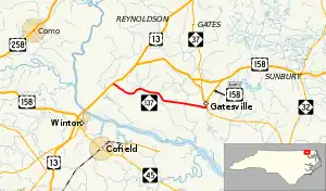 North Carolina Highway 137 (NC 137) is a 8.6-mile-long (13.8 km) highway entirely in Gates County, North Carolina. NC 137 runs from NC 37 in Gatesville to US Highway 13/US Highway 158 (US 13/US 158) north of Winton.