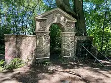 In the Edwardian era the Northern Line proposed an extension to Golders Green via Hampstead. An intermediate stop at North End was a key part of the plan. A large swathe of new housing was anticipated in the area. However conservationist Henrietta Barnett acquired the land from Eton College and donated it as the Hampstead Heath Extension. In 1906 the partially-built station was put on hold.[3] Although further housebuilding took place in the vicinity, the station was never finished. Consequently, there is a comparatively long gap between Hampstead and Golders Green station. Had the station opened, it would have been the deepest on the London Underground.[4]