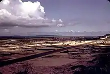 ![]() Oblique airphoto of North Field, Tinian, 1945, showing the massive runway system and number of hardstands. On each hardstand, a B-29 was parked and maintained. | |