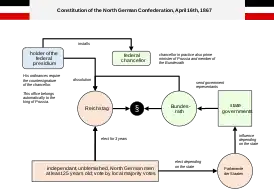 - ↑ An alternative translation is "North German Federation." The German word Bund is used in the German constitutional history (a) for confederations (associations of states, in German Staatenbund) such as the German Confederation of 1815, but (b) also for federations (federal states, in German Bundesstaat or Föderaler Staat) such as the Federal Republic of Germany or the United States of America.