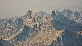 North Raker, also known colloquially as "The Rakers", is part of the Sawtooth Range which is a subset of the Rocky Mountains.[4] The remote mountain is situated 18 miles south-southwest of Stanley, Idaho, in the Sawtooth National Recreation Area. Precipitation runoff from the mountain drains to the South Fork Payette River via Pinchot Creek (west slope) and Fall Creek (east slope). Topographic relief is modest as the summit rises 2,400 feet (730 meters) above each creek in approximately one mile. The first ascent of the summit was made by Fred Beckey and Pete Schoening in 1949.[1] This landform's toponym has been officially adopted by the United States Board on Geographic Names.[3] The descriptive name was applied in 1927 by surveyor Arval Anderson and refers to how the shape of the peak resembles the "raker tooth" of a crosscut saw.[5]