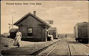 North Truro (also known as Pond Village) first saw train service in 1873, when the Old Colony Railroad extended the tracks from Wellfleet, Massachusetts to Provincetown, with a depot probably built the same year. The first train actually arrived on July 23, 1873.[2] It was razed when trackage was dismantled between North Eastham and Provincetown by the New York, New Haven & Hartford Railroad in Fall 1960.