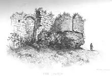 The castle was built under the stewardship of Simon de Senlis, the first Earl of Northampton, in 1084.[2] It took several years to complete, as there is no mention of it in the Domesday Book, the great survey of England completed in 1086. In the reign of Henry II, the castle was in the hands of the Crown. In the First Barons' War between King John and his barons, the latter used it as a stronghold. When the King prevailed, the castle was entrusted to Falkes de Breauté, whom the King admired for his courage during the war.[3]