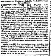 John Pope was born in Marnhull, Dorset. His father was Robert Pope who was described as “a gentleman”. He did not marry so when he died in 1784 he left his estate to the children of his sister Jane. His will[10] indicates that he was extremely wealthy as he left large bequests to all of his six Blanchford nieces and nephews. Northaw Place was left to his younger nephew Thomas Blanchford and when he died two years later it went to his brother Robert Pope Blanchford. Shortly after his inheritance Robert sold it to Alexander Watt. Alexander Watt sold the house in about 1800 to Thomas Gould. Thomas Gould was a wealthy London merchant who bought Northaw Place as his county residence.[11] In 1784 he married Frances Hunt and the couple had twelve children. When Thomas died in 1829 he left Northaw Place to his wife Frances and all twelve of his children inherited large sums of money.[12] When Frances died in 1836 the house was advertised for sale.[13] The sale notice is shown. It was bought by David Cameron.
