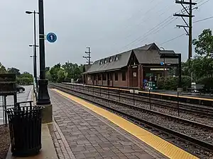 Northbrook is a commuter railroad station on Metra's Milwaukee District North Line in Northbrook, Illinois. The station is located at 1401 Shermer Road, is 21.0 miles (33.8 km) away from Chicago Union Station, the southern terminus of the line,[2] and serves commuters between Union Station and Fox Lake, Illinois. In Metra's zone-based fare system, Northbrook is in zone E. As of 2018, Northbrook is the 28th busiest of Metra's 236 non-downtown stations, with an average of 1,259 weekday boardings.[1] Metra trains pass through about every hour in each direction outside of rush hours, and up to every 20 minutes during rush hour. Bike racks are available at the station, on either side of the tracks. in 2016, an electrified sign was installed, warning commuters and pedestrians to look for trains. The tracks that run through Northbrook are also utilized by Amtrak's Hiawatha and Empire Builder, as well as freight trains.