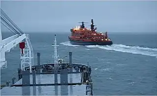 The development of the icebreaking fleet is the most important condition for constant navigation in Arctic waters. Since 2008, the structure of Rosatom includes the Russian nuclear icebreaker fleet, which is the largest in the world with a container ship, four service vessels and seven nuclear-powered icebreakers (“Yamal”, "50 Let Pobedy", "Taymyr", "Vaygach", "Arctic", "Siberia" and Ural[31]).[32] The last three are the latest universal icebreakers of the 22220 project, and the world's only transport vessel with the Sevmorput nuclear power plant in operation.[33]