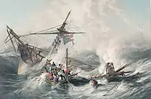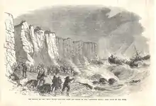The Belle was constructed in 1853, under the ownership of J. P. Whitney and Co. of New Orleans.[3][4] Her common routes were New Orleans to Liverpool and Le Havre, carrying wheat on the outbound run. A barque of 1,150 tons burden[4][5] with a crew of 23, she was on a voyage from New York to London,[6] with a cargo of wheat, flour, and linseed cake,[7] when as a result of an unusually heavy gale had to put into Kingsgate, Kent. She anchored 3/4 of a mile from the shore,[8] however by 6 am she was riding heavily, the sea occasionally breaking completely over her. The storm was so ferocious that the main and mizzen masts were cut away by the crew at 6.30am. The Margate lugger Victory, along with the Ocean, and the Eclipse attempted a rescue and possible salvage.[9] The Victory was lost along with her crew at 11.30 am. The storm raged all day and local lifeboats were not able to launch. The Belle parted from her anchors at midnight, and was driven onto the rocks beneath nearby cliffs, at Foreness Point.[10] The crew lashed themselves to the one remaining mast and were spotted from the beach at dawn. Two lifeboats, the Mary White and the Culmer White made three trips to rescue them. The lifeboats and crew were from Broadstairs and Margate. The Mary White had to be hauled and dragged two miles over fields of snow to bring it to a place from which it could be launched.[11][9][12][6] Captain Tate and his crew from the Northern Belle were all saved.[13]