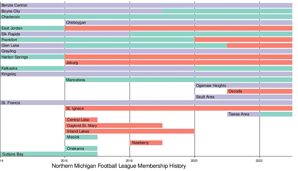 - ↑ [email protected], Drew Kochanny (231) 439-9345. "Northern Michigan Football League changes coming at start of 2020 season". Petoskey News-Review.